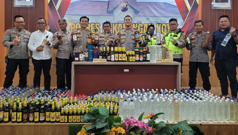 Kapolres Pekalongan Kota AKBP Riki Yariandi dan sejumlah PJU menunjukkan barang bukti ratusan botol miras yang disita menjelang Nataru.--